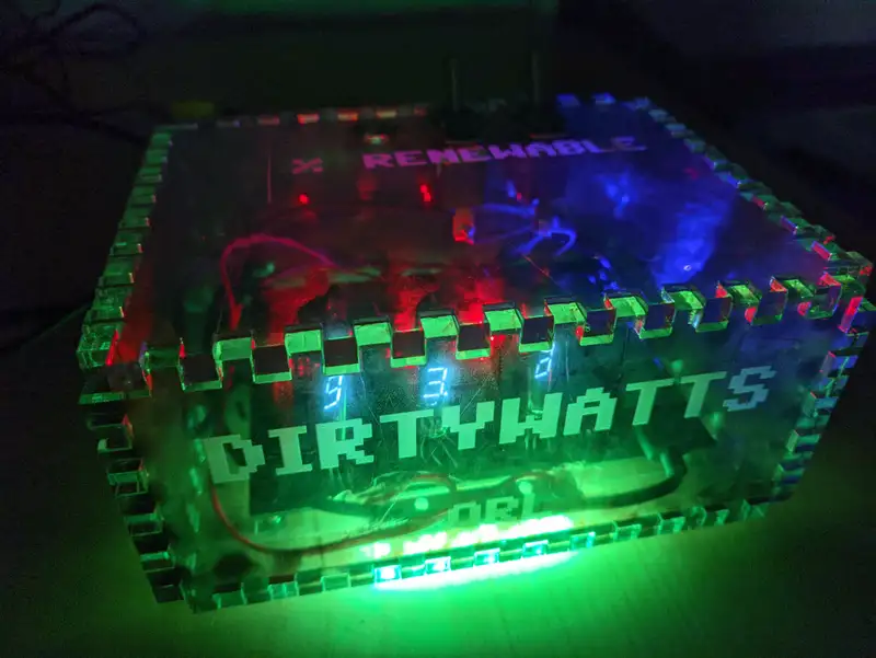 Aside from the main dashboard, there was a side project being worked, a DirtyWatts Indicator. Taine Reader and Ara Bartlett with the mentoring of Mac Jones built a hardware summary device that showed the state of the power grid through a single Indicator light. It scales from red at worst, to orange, to yellow, to green at best, considering the which sources of power are active to give a metric of our “clean” your power is.