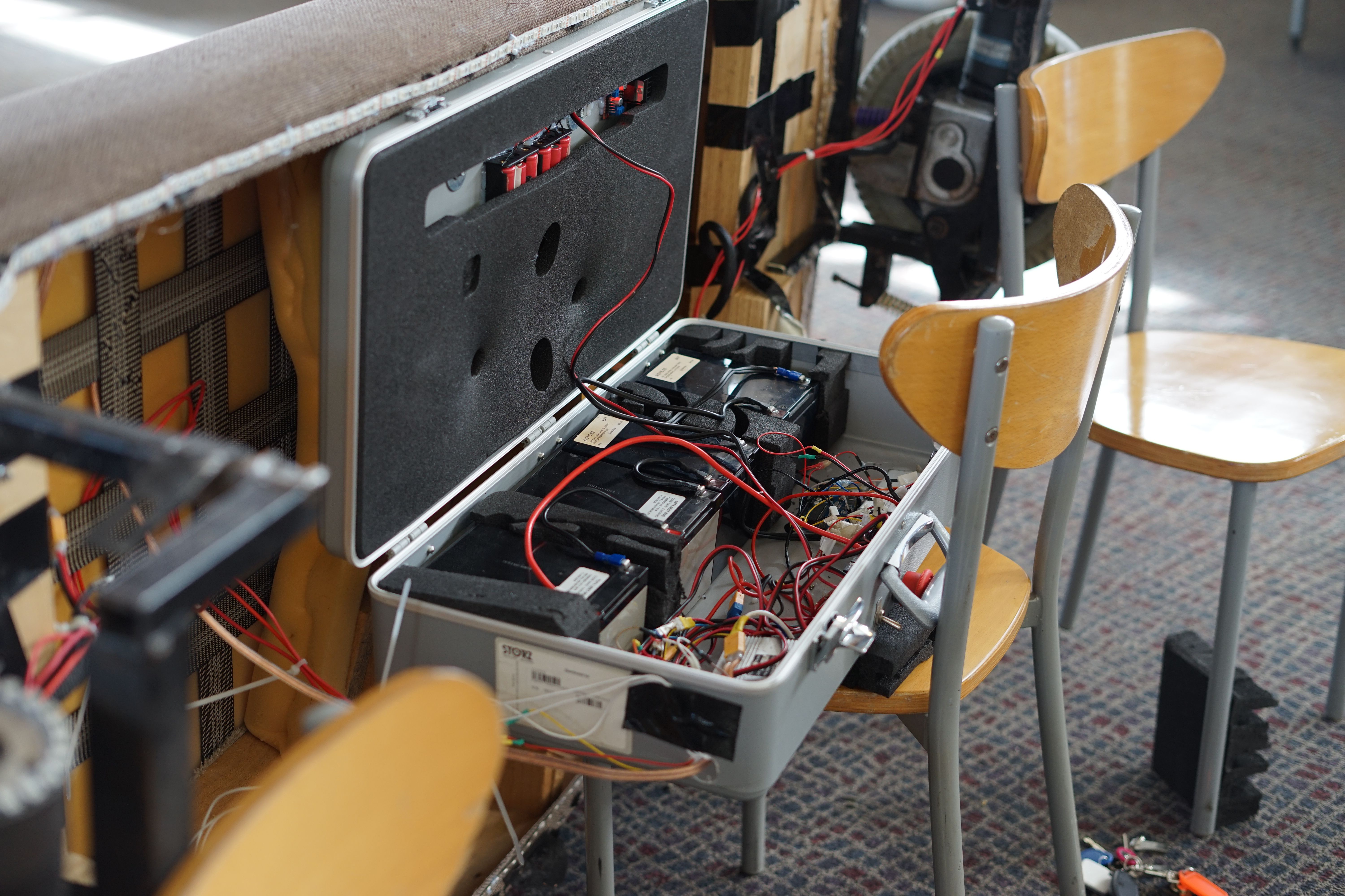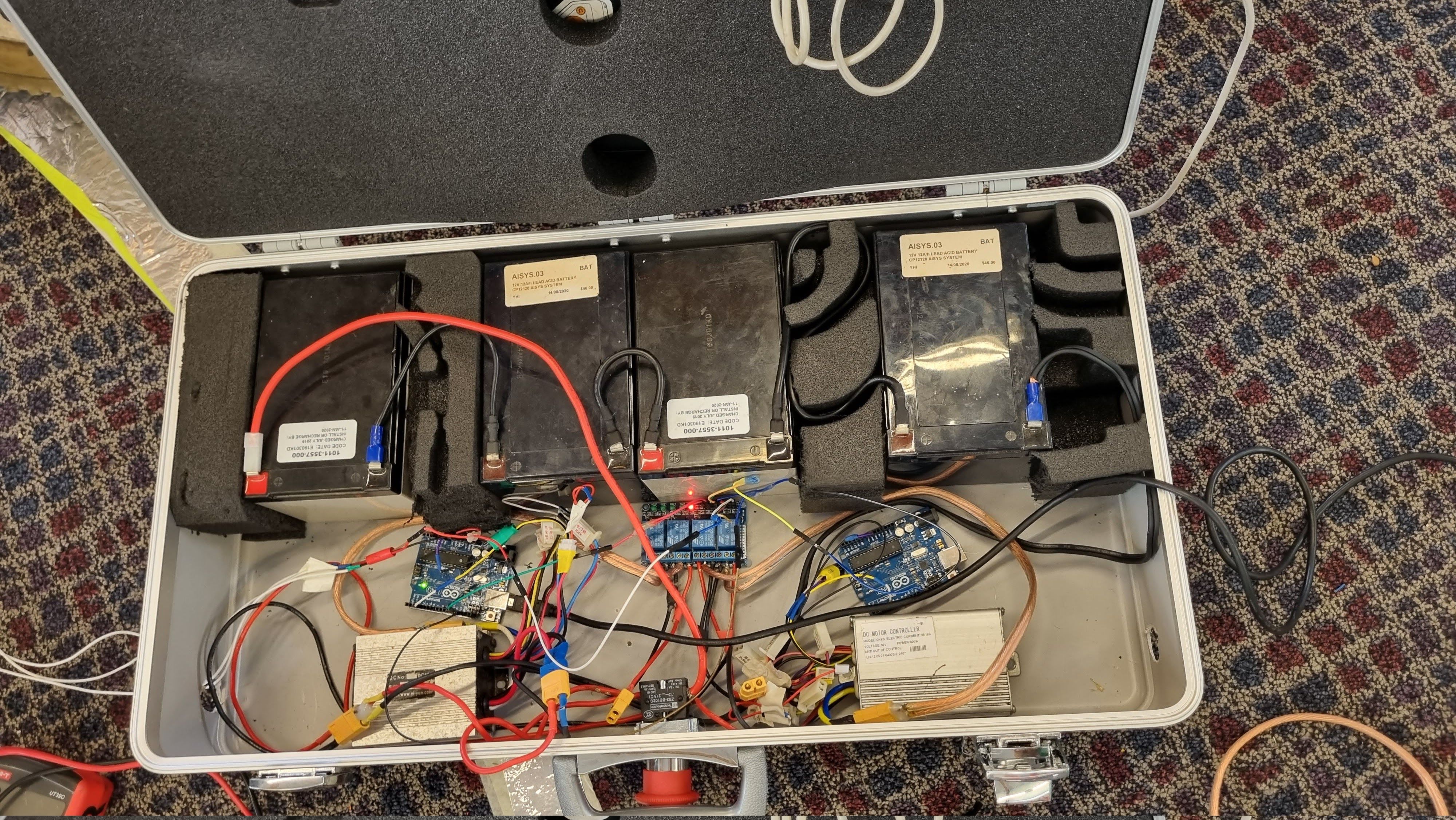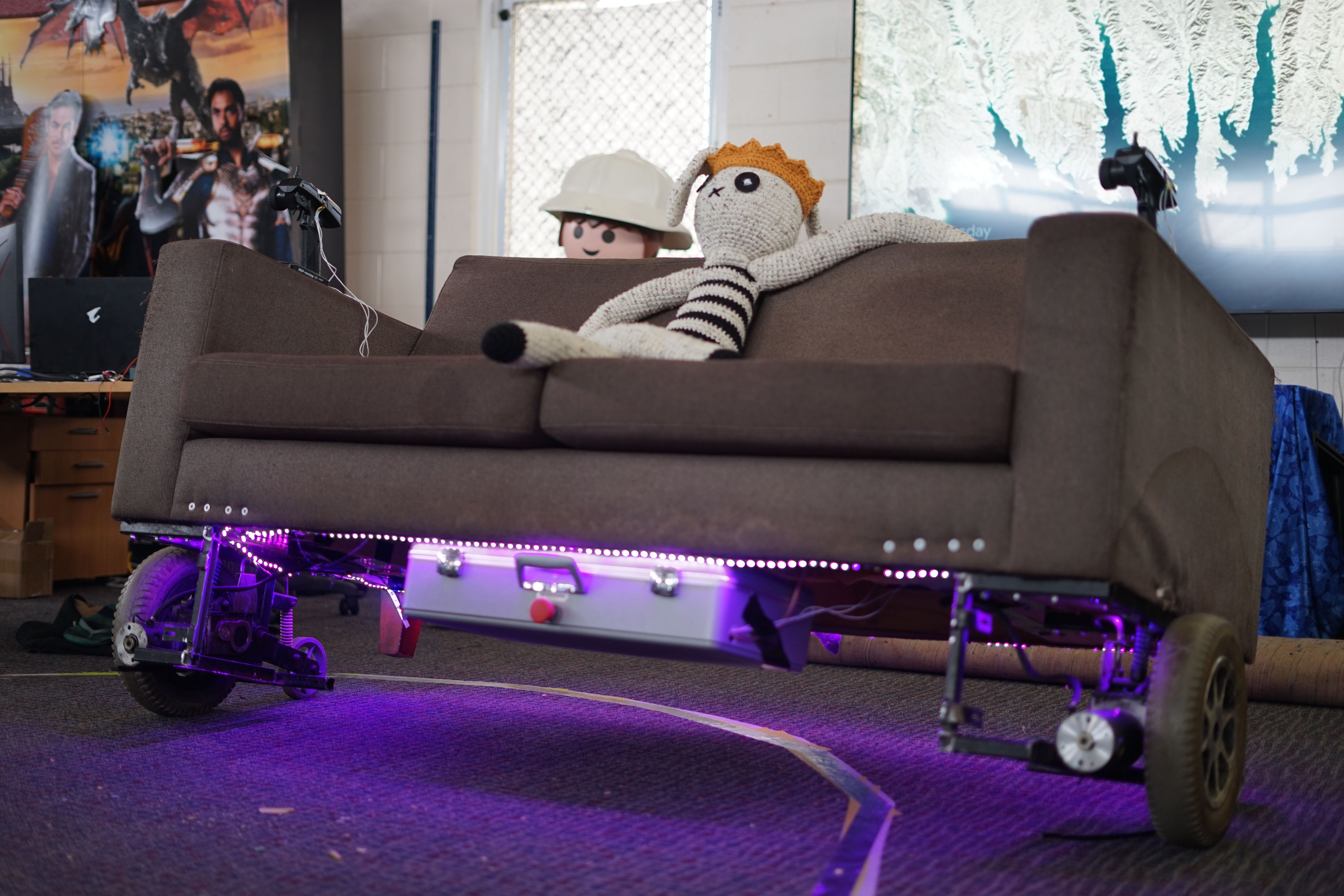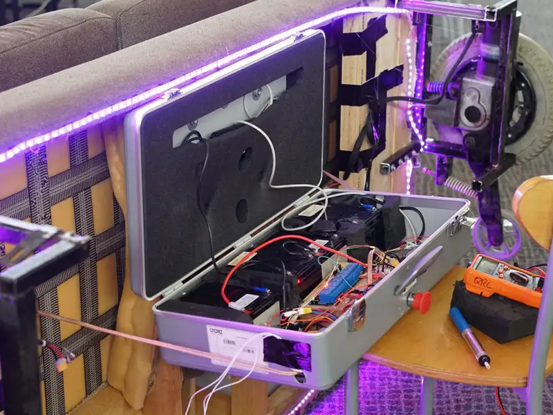 All of those electronics were stuck into a briefcase bolted to the underside of the couch for easy maintenance. Underglow, and speed animations around each motor was added for the all important flair.
